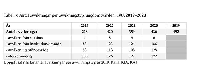Bland brottsdömda unga inom den slutna ungdomsvården (LSU) noterades en avvikning under 2023. Den inträffade då en ungdom i utslussningsfasen inte återkom på utsatt tid efter en hempermission. 2022 noterade SiS två avvikningar inom den slutna ungdomsvården.