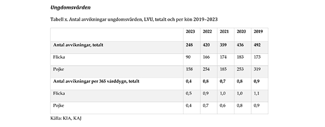 Avvikningarna inom ungdomsvården (LVU) minskar inte bara i faktiskt antal, utan även om man tittar på antalet per 365 vårddygn. Det rör sig om en minskning från 0,8 till 0,4 avvikningar per 365 vårddygn från 2022 till 2023.