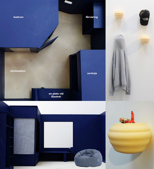 Med utgångspunkt i en standardplan för ett SiS-hem har Kristina skapat prototyper för möblering, förvaring och ytskikt där trygghet, integritet och egenmakt står i centrum. Hon har bland annat flyttat sängens plats för att skapa insynsskyddat rörelseutrymme och designat en “klotterkoja” – en sovhörna där barnen kan rita på den pappersklädda sängstommen som en form av uttryck och bearbetning.